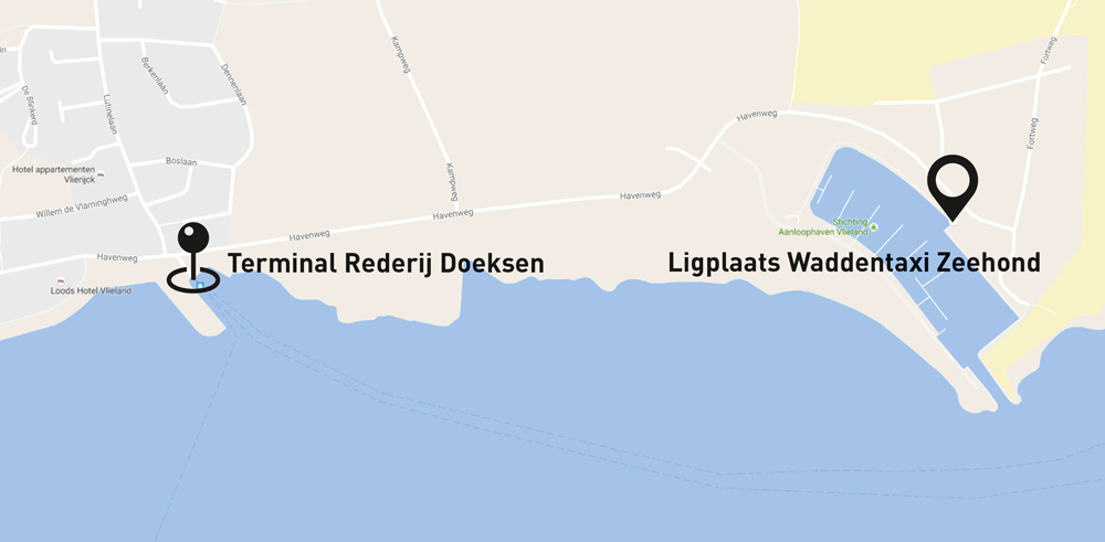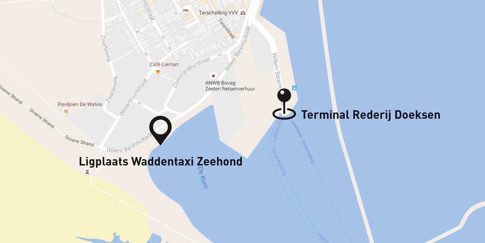 Je reist met de watertaxi de Zeehond, dan reis je niet via de reguliere veerterminals van Rederij Doeksen. De Zeehond heeft eigen opstapplaatsen: